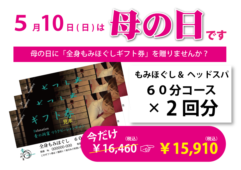 【母の日限定!】全身もみほぐし&ヘッドスパ 60分コース ×2回分がお得!!今だけ¥16,460→¥15,910