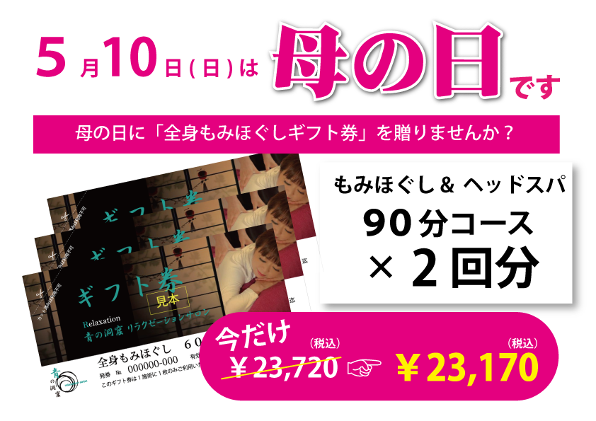 【母の日限定!】全身もみほぐし&ヘッドスパ 90分コース ×2回分がお得!!今だけ¥23,720→¥23,170
