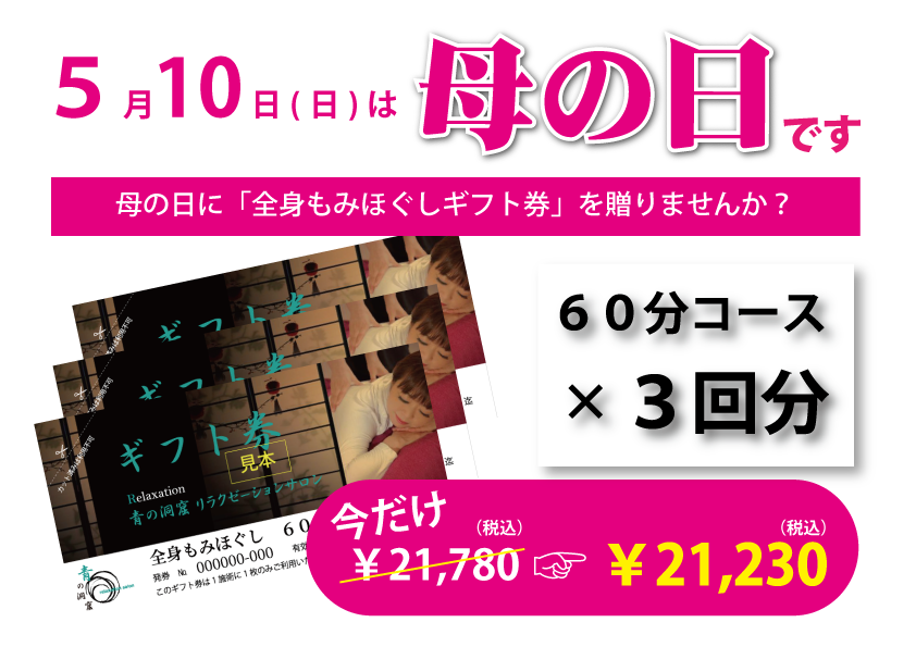 【母の日限定!】全身もみほぐし 60分コース ×3回分がお得!!今だけ¥21,,780→¥21,230
